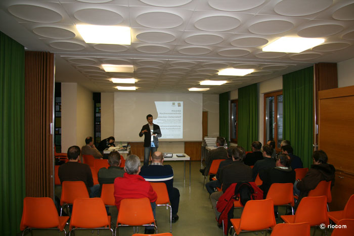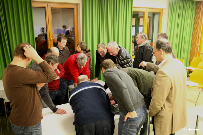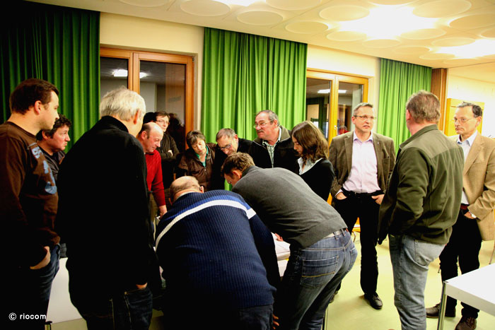 Einleitende Worte durch DI Schwingshandl, Geschäftsführer und Inhaber von riocom Besprechung am Plan mit den Eigentümern entlang der Auslaufstrecke Besprechung am Plan mit den Eigentümern entlang der Auslaufstrecke Planbesprechung mit DI Arnold Putz (riocom) und Vize-Bgm. Muck Projektvorstellung durch riocom Teilnehmer der Informationsveranstaltung Teil 2 Besprechung der Änderungen im künftigen Becken im Vergleich zum derzeitigen Zustand am Plan